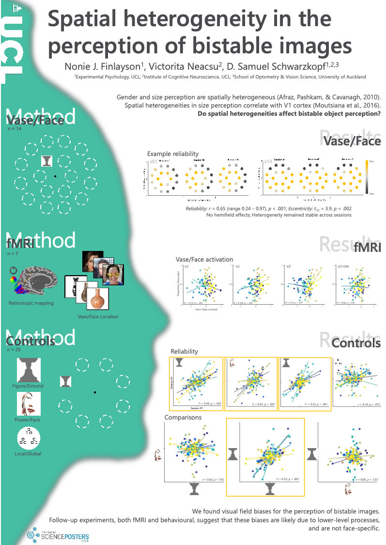 Finlayson, N.J., Neacsu, V., & Schwarzkopf, D.S. (2017). Spatial heterogeneity within perception of bistable images. ECVP, Berlin, Germany: 27-31st Aug.