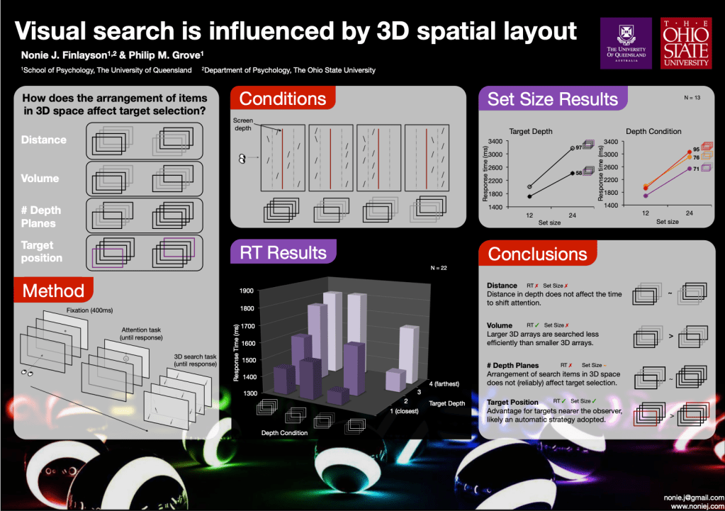 Finlayson, N.J. & Grove, P.M. (2014). Visual search is influenced by 3D spatial layout. Vision Sciences Society Meeting. Naples, Florida. 16-21 May. [abstract]