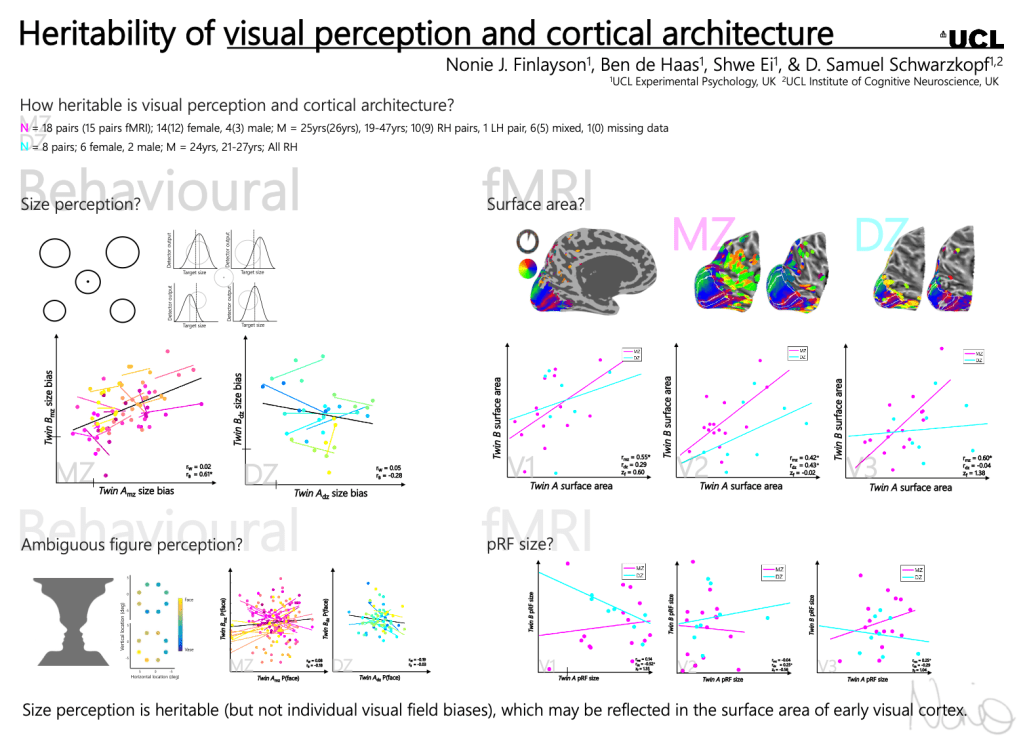 Finlayson, N.J., de Hass, B., Ei, S., & Schwarzkopf, D.S. (2017). Heritability of visual perception and cortical architecture. VSS, St Pete Beach, Florida: 19-24th May.